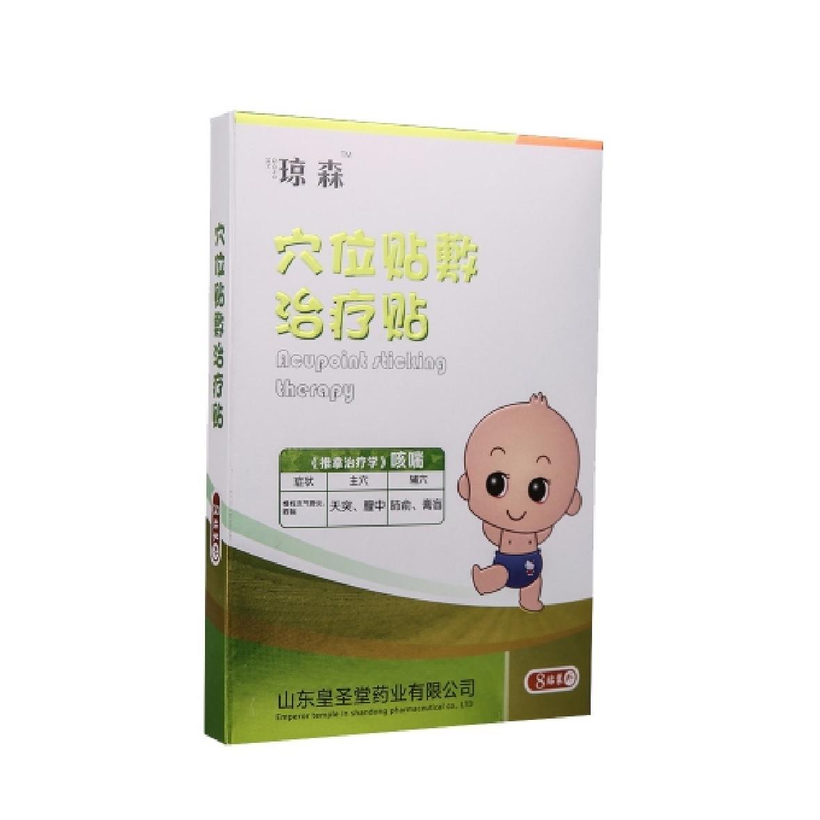 【 规 格 】 5cm*5cm*2贴*4袋【结构性能】穴位贴敷止咳贴由远红外陶瓷粉、丙烯酸压敏胶、水刺无纺布、不锈钢珠及离型纸制成。 穴位贴敷止咳贴的压敏胶布剥离强度不小于1.0N/cm,持粘性应不大于2.5mm。远红外发射波长范围8μm-15μm,法相比辐射率≥75%。【适用范围】皇圣堂咳喘穴位贴敷治疗贴针对人体特定穴位,对中医穴位起刺激作用。【使用方法】清洁相应穴位,打开包装,取出穴位贴敷治疗贴,将贴剂的隔离膜撕去,以钢珠对准相应穴位敏感点贴压,1片/穴、天。【 禁 忌 症 】孕妇、皮肤溃烂处禁用。【 贮 存 】本产品应贮存在相对湿度不超过80%,无腐烂性气体,阴凉、干燥、通风良好、干净的环境内。【执行标准】鲁械注准20152260318【生产许可】鲁食药监械生产许20140114号【注册证号】鲁械注准2015226031【生产厂家】山东皇圣堂药业有限公司【 地 址 】山东单县经济技术开发区
