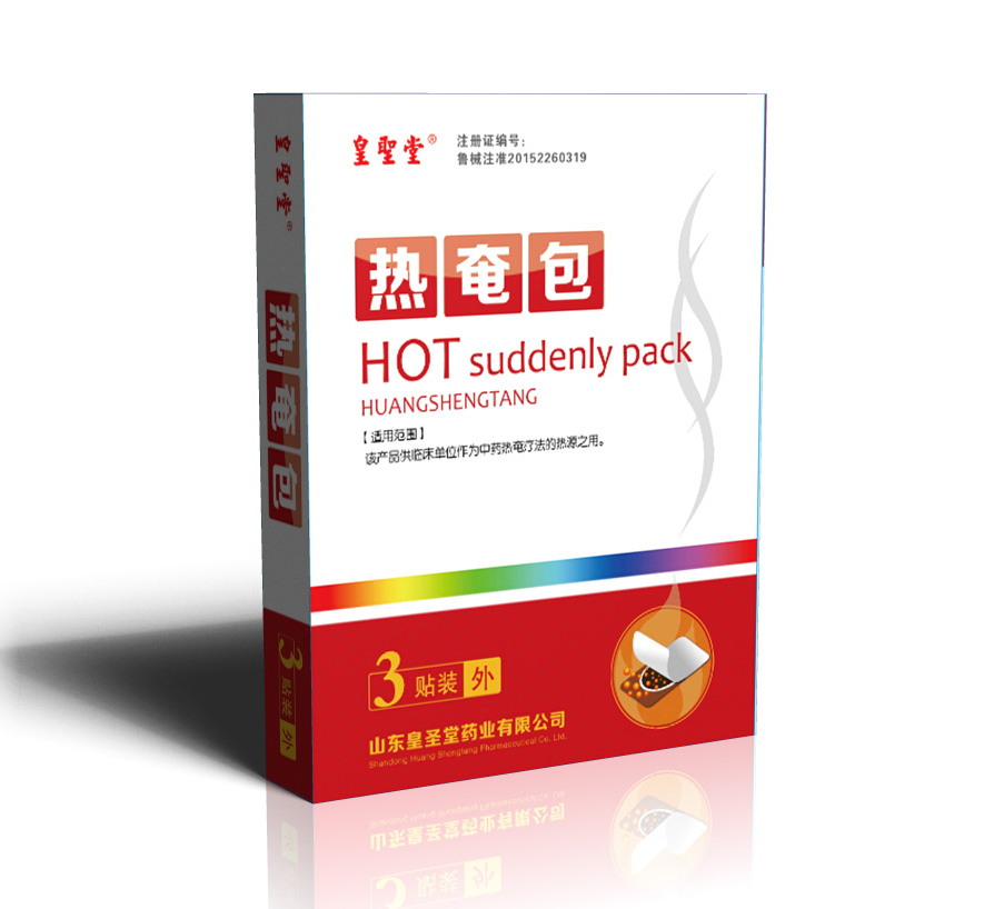 【 规 格 】 9cm×11cm×1贴×2袋 多种规格 可贴牌定制代加工OEMODM【结构性能】 热奄包由内装物和外袋组成,外袋由敷膜无纺布和含有压敏胶的无纺布及硅油纸制成。【适用范围】 热奄包适用于肩周炎、腰肌劳损、颈椎病、腰椎间盘突出、风湿性关节炎(非急性期)等的辅助治疗。【使用方法】 清洁患处,取出贴剂揭开防粘层,将胶面贴于患处,轻轻按压即可,每24小时更换一次。【 禁 忌 症】 皮肤病、糖尿病、急性期炎症患者、孕妇下腹部、皮肤溃烂处禁用。【 贮 存 】 密闭、置阴凉干燥处保存。【执行标准】 YZB/鲁0072-2007【生产许可】 鲁食药监械生产许20140114号【注册证号】 鲁械注准20142260319【生产厂家】 山东皇圣堂药业有限公司【 地 址 】 山东单县经济技术开发区