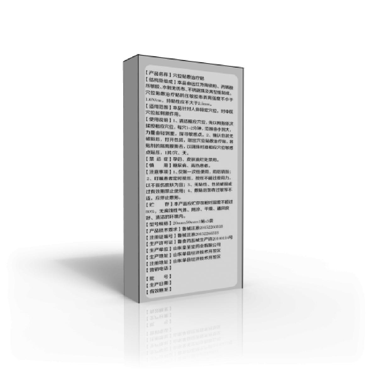 【 规 格 】 8.5x8.5cmX1贴/袋X3袋/盒X50盒 多种规格 可贴牌定制OEMODM代加工【结构性能】 鼻炎贴由远红外陶瓷粉、丙烯酸压敏胶、水刺无纺布、不锈钢珠及离型纸制成。鼻炎贴的压敏胶布剥离强度不小于1.0N/cm,持粘性应不大于2.5mm。远红外发射波长范围8μm-15μm,法相比辐射率≥75%。【适用范围】 本品对于过敏性鼻炎、感冒引起的鼻塞、鼻息肉、鼻窦炎有显著的辅助治疗作用。【使用方法】 清洁相应穴位,打开包装,取出鼻炎贴,将贴剂的隔离膜撕去,以钢珠对准相应穴位敏感点贴压,1片/穴、天。【 禁 忌 症 】 孕妇、皮肤溃烂处禁用。【 贮 存 】 本产品应贮存在相对湿度不超过80%,无腐烂性气体,阴凉、干燥、通风良好、干净的环境内。【执行标准】 鲁食药监械生产许20140114号【生产许可】 鲁械注准20152260318【注册证号】 鲁械注准20152260318【生产厂家】 山东皇圣堂药业有限公司【 地 址 】 山东单县经济技术开发区