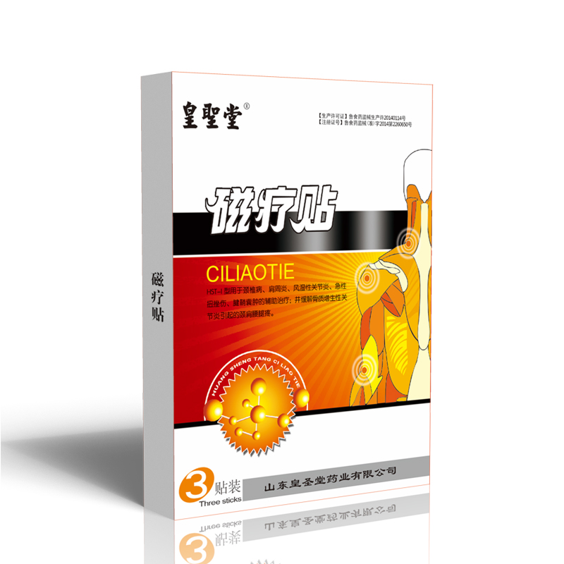 【 规 格 】 9.5cm X 13cm X 1贴 X 3袋 多种规格 可贴牌OEM代加工【结构性能】 该产品由永磁粉剂、永磁片、透气胶布、防粘纸制成【适用范围】HST-A 用于颈椎病的辅助治疗【使用方法】使用本品时,先清洁患部皮肤,揭去防粘膜将本品直接贴于患处,将胶膜紧贴皮肤并压紧周边,使粘贴材料贴实。2-3日更换一次【 禁 忌 症 】体内有植入电子产品和金属产品禁用,有严重心脏病患者禁用;孕妇禁用;皮肤过敏者慎用【 贮 存 】密封、置阴凉干燥处保存【执行标准】 YZB/鲁00174-2012【生产许可】 鲁食药监械生产许20090118号【注册证号】鲁食药监械(准)字2014第2260181号【生产厂家】 山东皇圣堂药业有限公司【 地 址 】 山东单县经济技术开发区